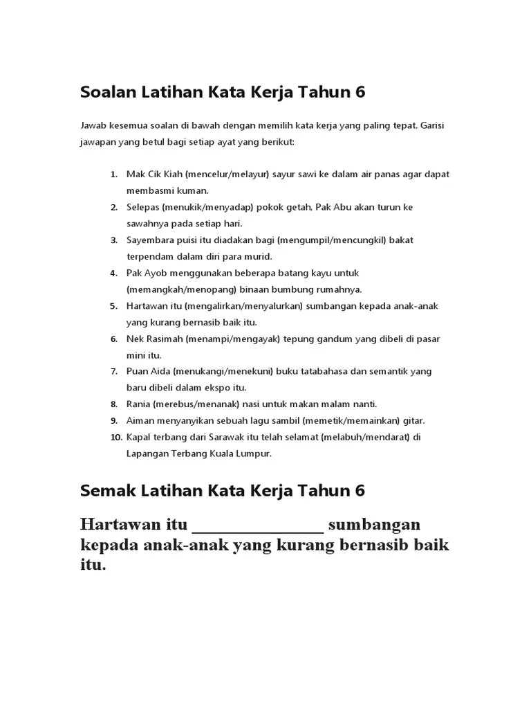 Soalan disediakan mengikut tema melalui pelbagai format soalan buku teks. ✓ bahan softcopy disediakan dalam 2 format:. You can do the exercises online or download the worksheet as pdf. Pilih kata kerja transitif yang sesuai.